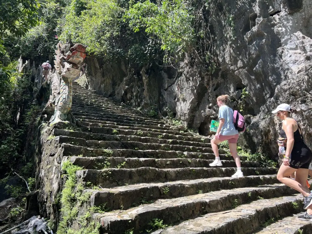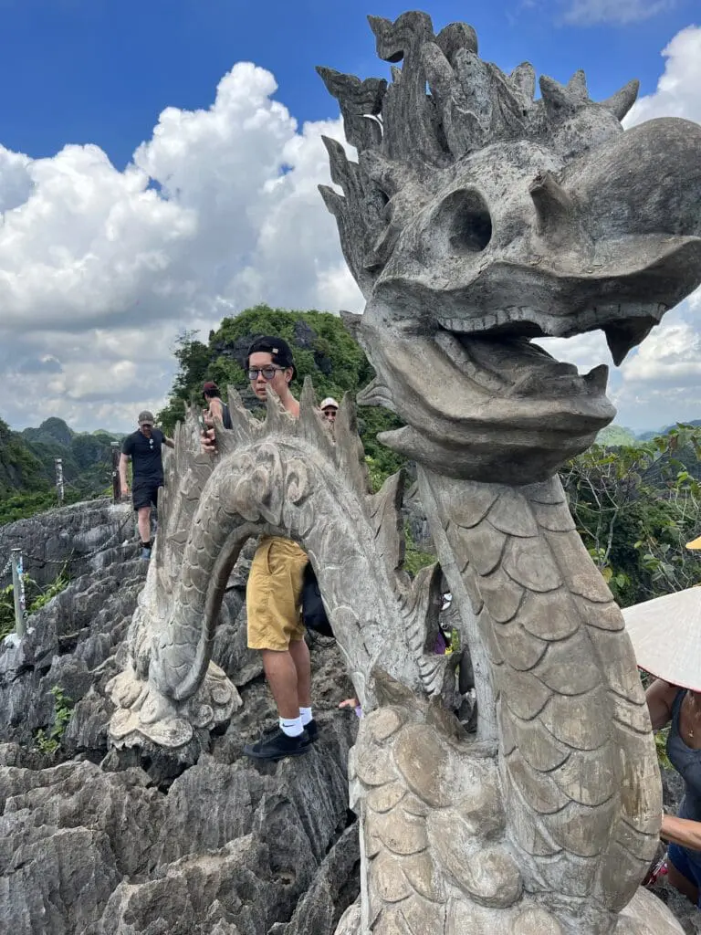 In Ninh Binh, there is one of the best views I’ve ever seen from on top of Ngoa Long Mountain, also known as Lying Dragon Mountain. It’s a short (in theory) hike up nearly 500 stairs to an ornate stone dragon at the rocky top of the mountain. It takes a bit of scrambling around the dragon statue to get to the end of the hike and some terrifying moments near the edge of the mountain, but the view is well worth it if you are in good physical condition. There is also another path leading to a lower viewpoint with a pagoda.