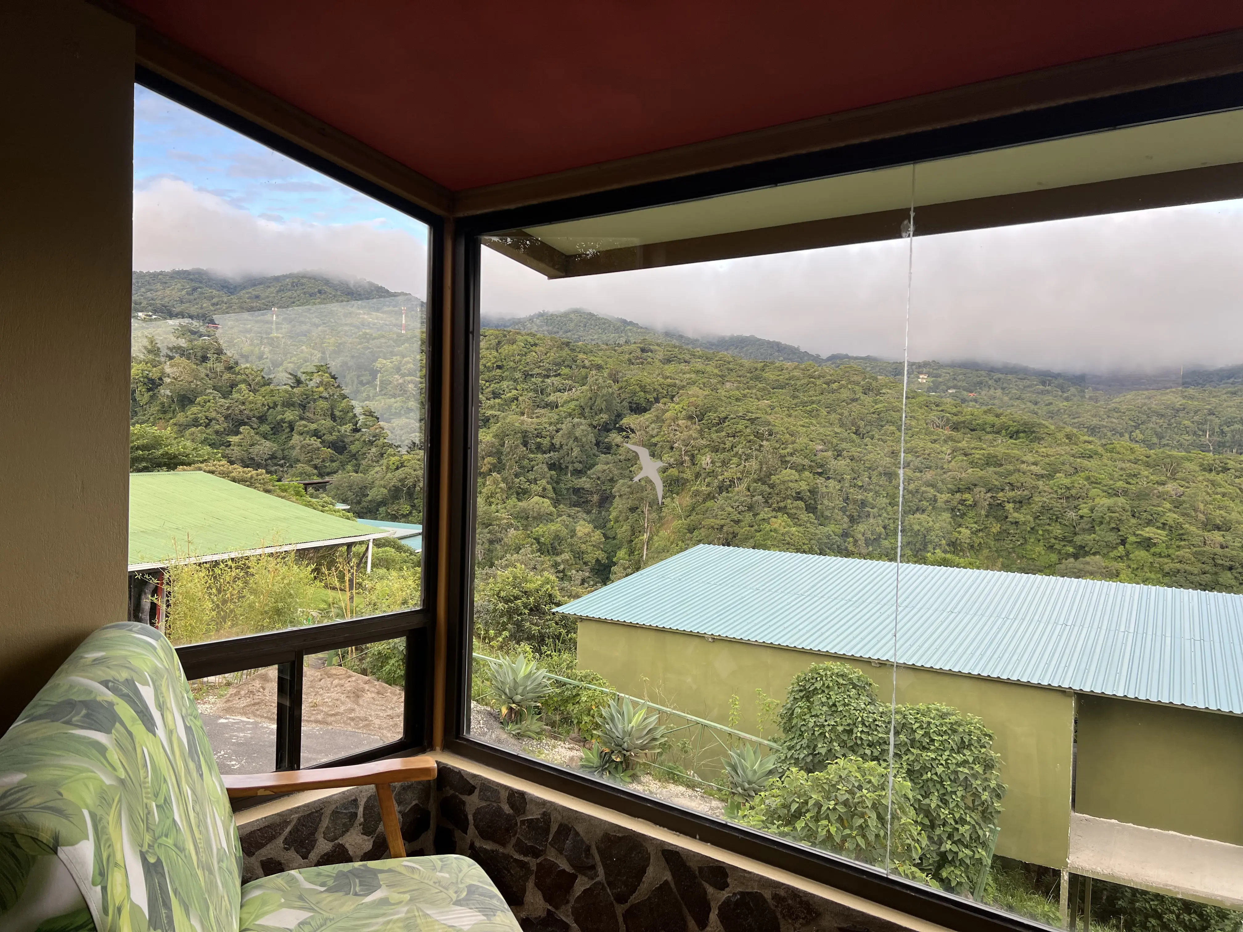 The Rainbow Valley Lodge is comprised of 12 private, stand-alone rooms. Each one is unique with different views and offerings. All of them, though, have private entrances and a parking spot right next to the room. The front desk is quaint and super friendly. There is no restaurant on property, but the hotel is only a mile away from downtown Santa Elena. There’s also a friendly little doggo that belongs to the front desk I believe and will come by and greet you from time to time during your stay; Huge plus in my book! Although the grounds are lacking as far as amenities, what makes up for everything is the view.