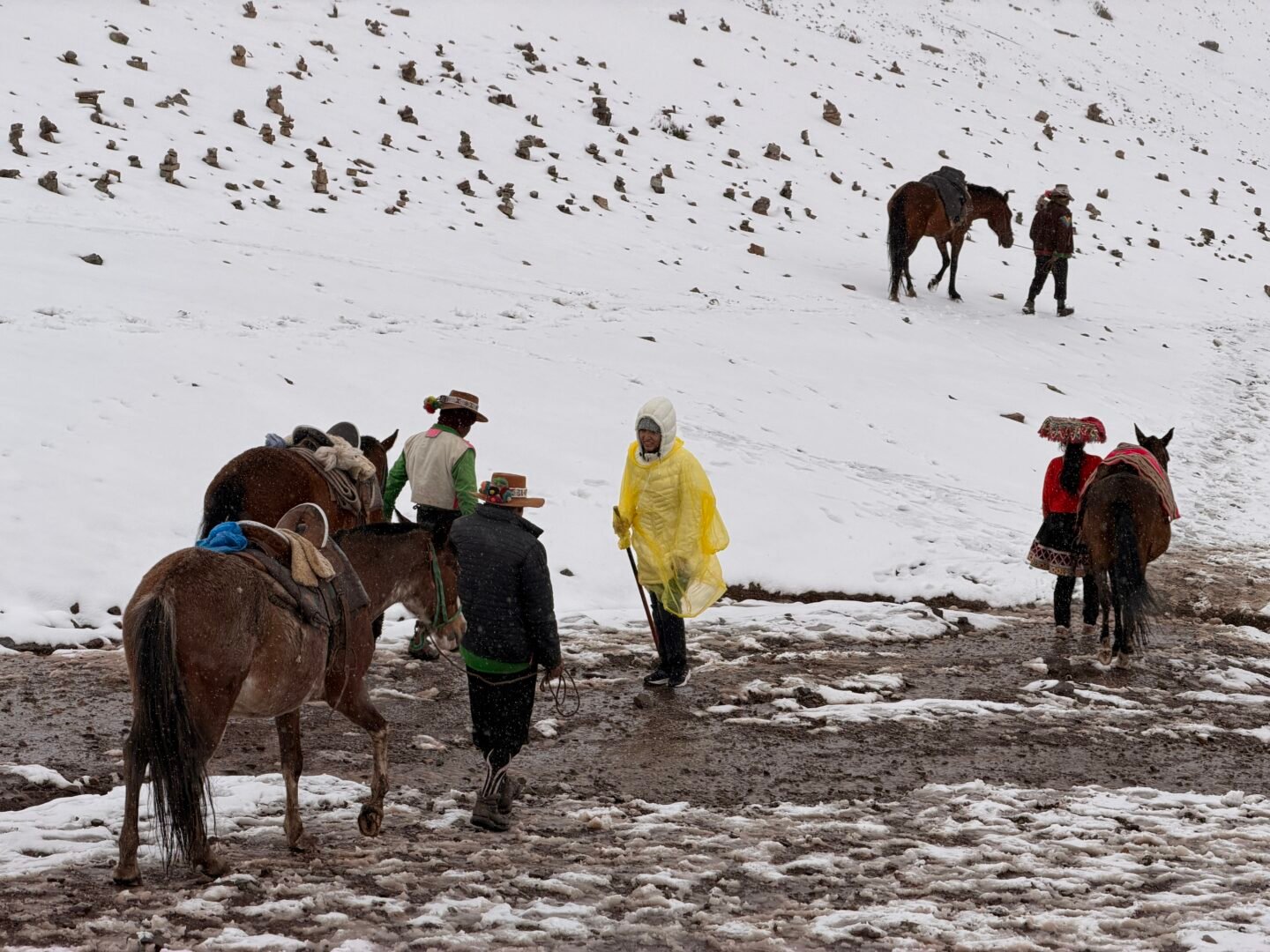 The ground was completely covered in snow. As we got out the van to collect the hiking poles our guide was passing out, we asked the question that we already knew the answer to—Does that mean we won’t see the colors of Rainbow Mountain?