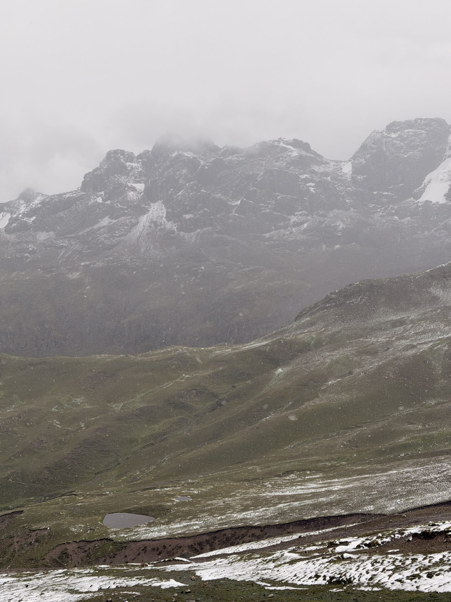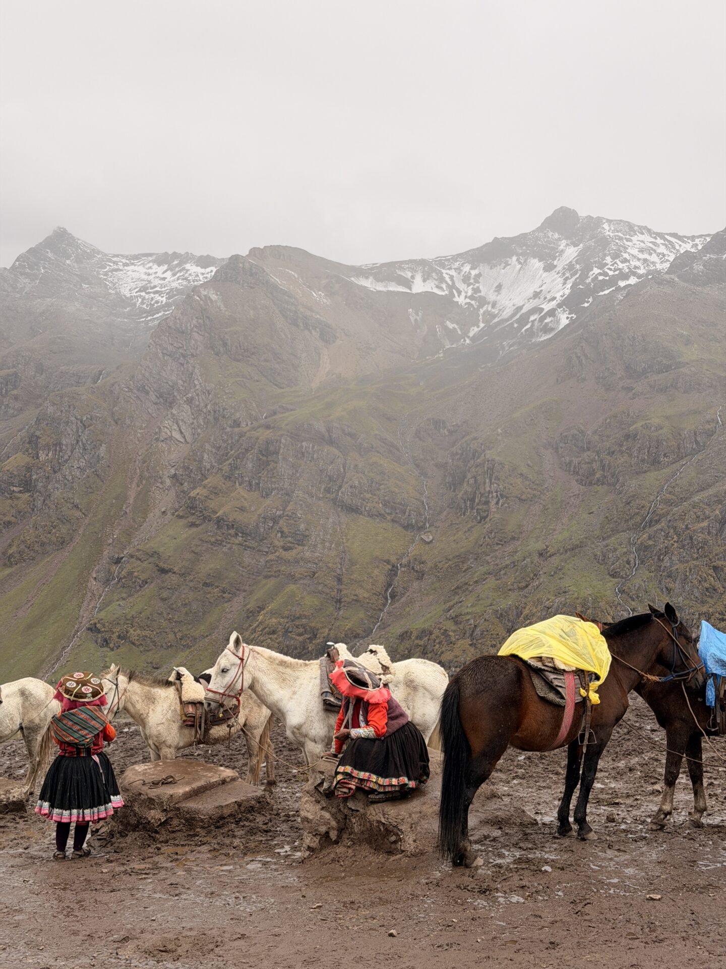 The rainy season in the Peruvian Andes typically runs from December through March, with January and February seeing the most rainfall. During these months, conditions at Rainbow Mountain can include rain, snow, fog, or sunshine — sometimes all within the same morning. For context, we visited the first week of January.
