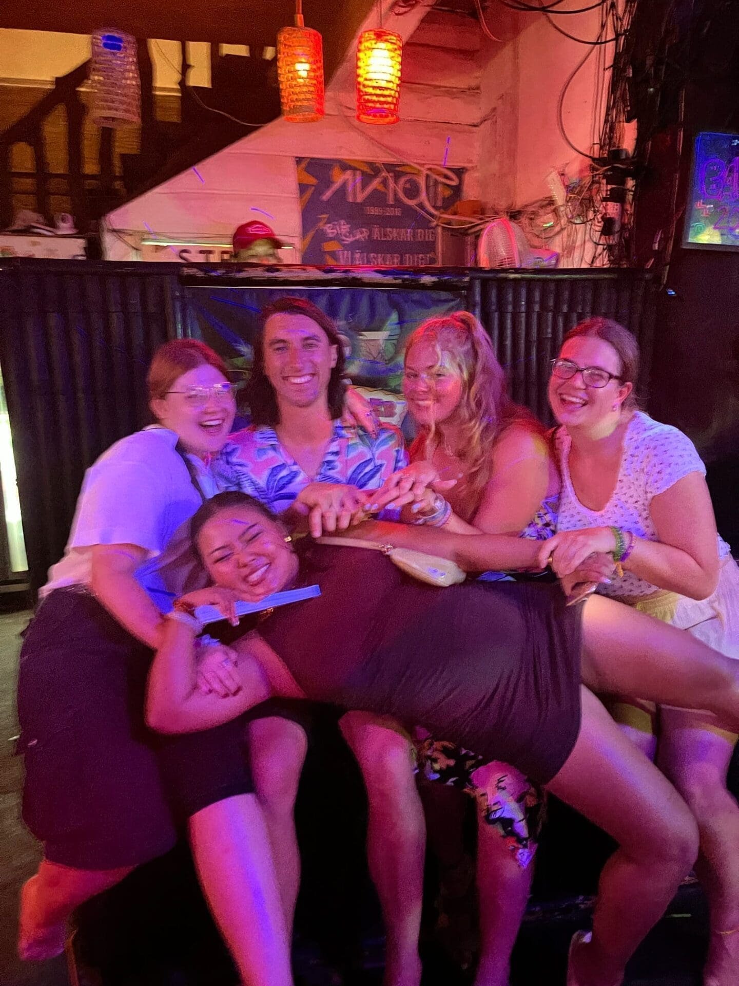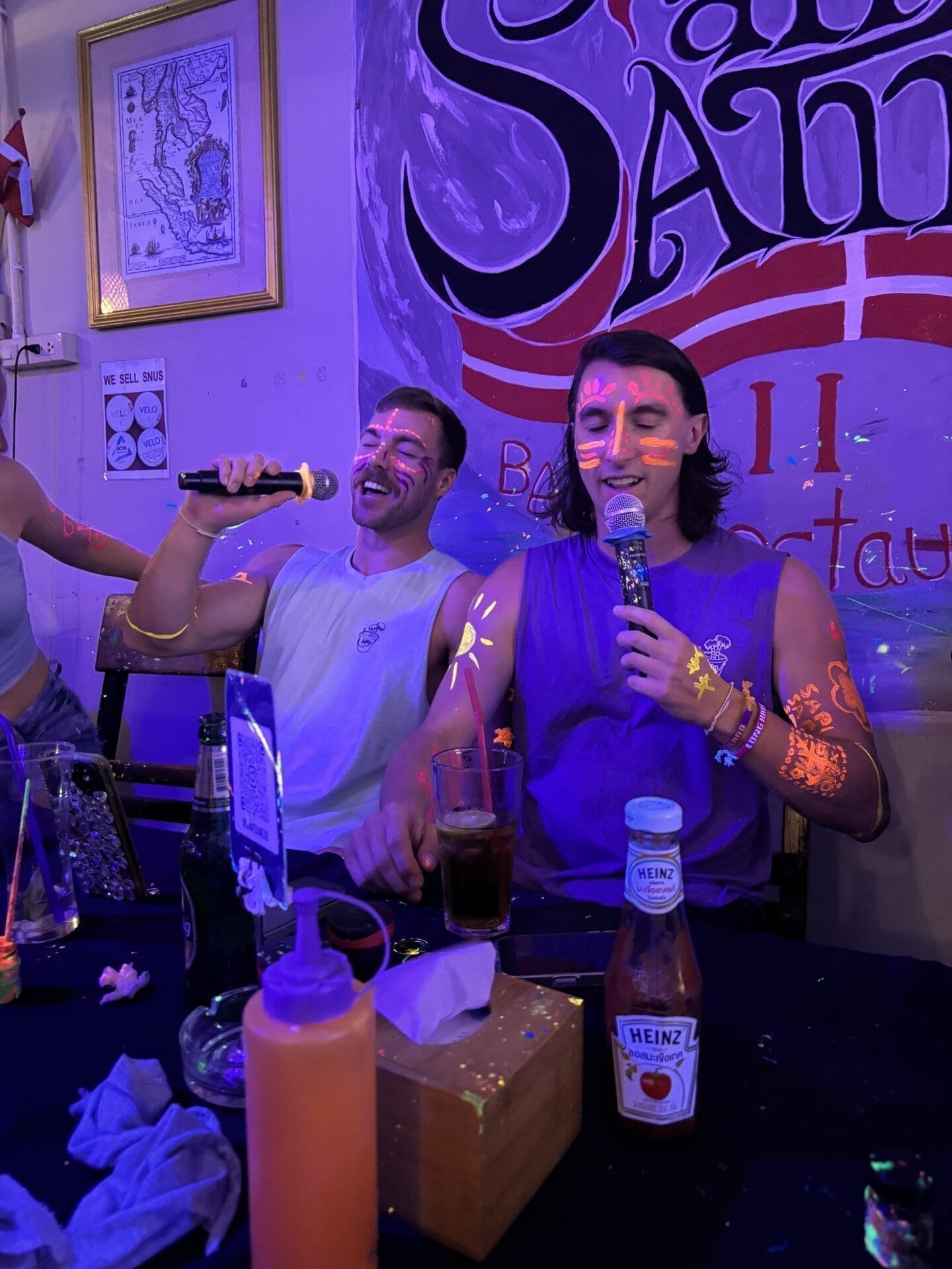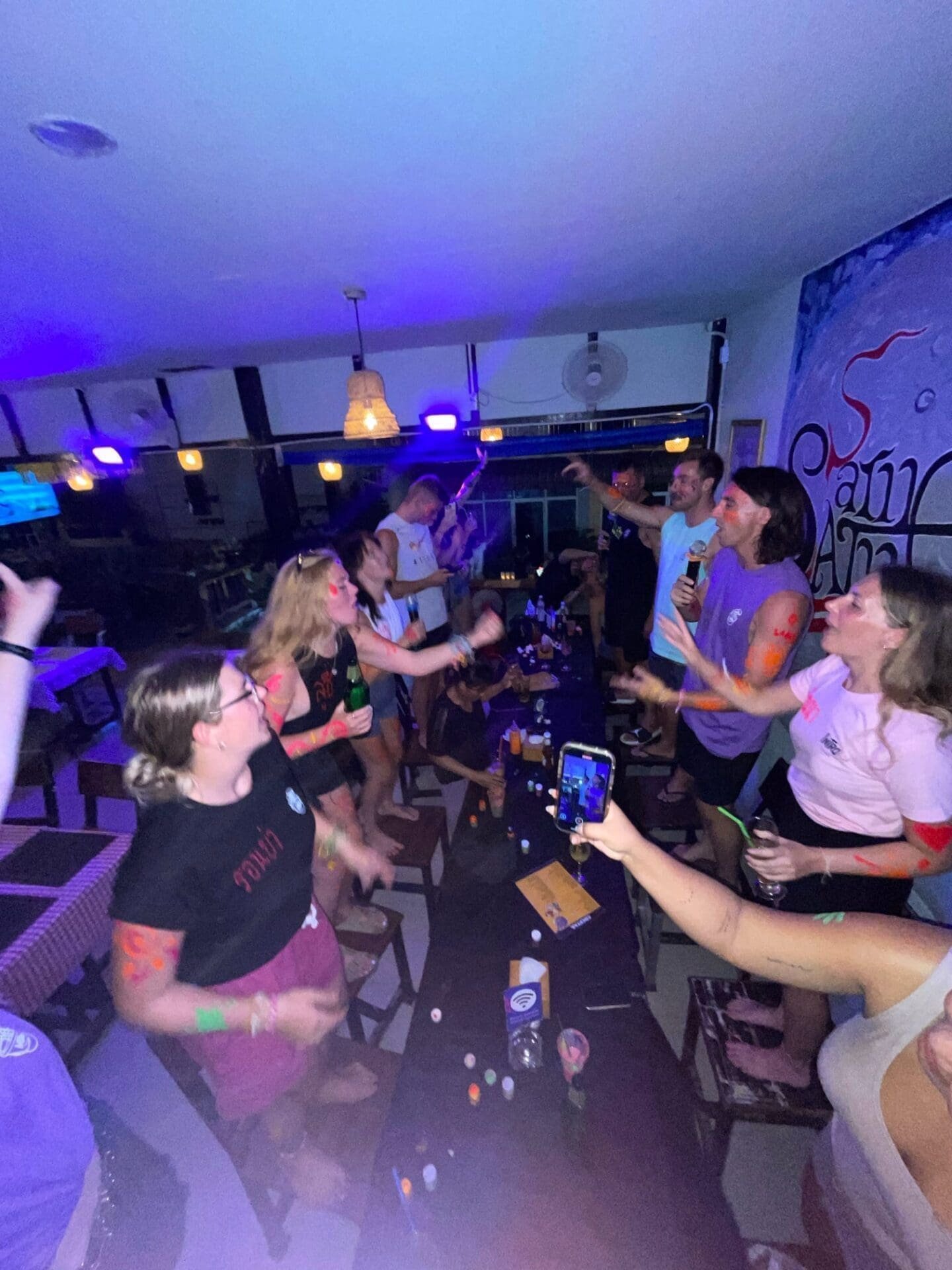 You meet up before taking a van twenty minutes away to dinner where you start the party by painting each other in glow in the dark paint. It’s like being in art class, but you get to paint everywhere—on yourself, on each other, on your shirt, on your face, arms, legs! After dinner you sing karaoke and stand on chairs (standing on chairs is one of the best parts of Thailand!).