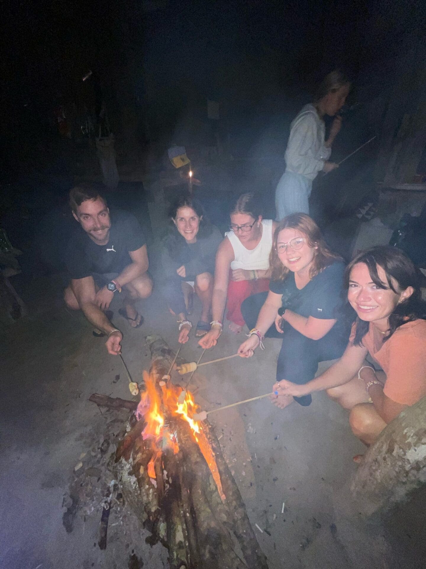 Waterfall camp arrival: Cool off in the waterfall at our camp after the very sweaty hike. Chill afternoon playing slingshot, eating jungle fries, Uno. Dinner by gaslamp and roasting marshmallows over campfire.