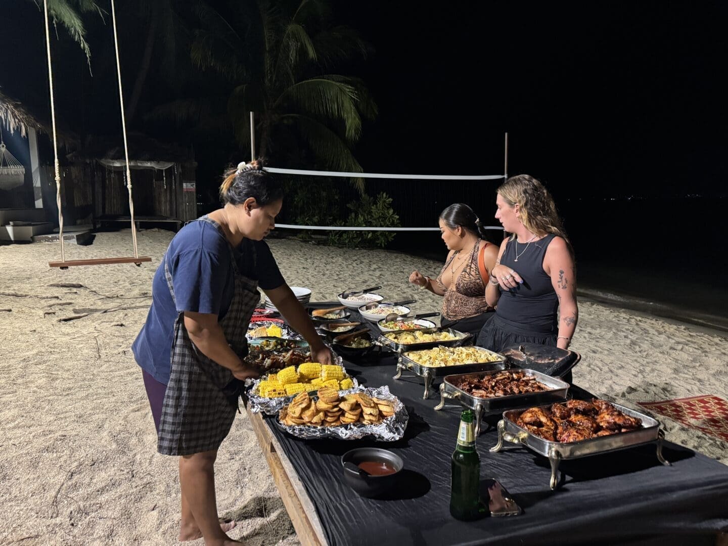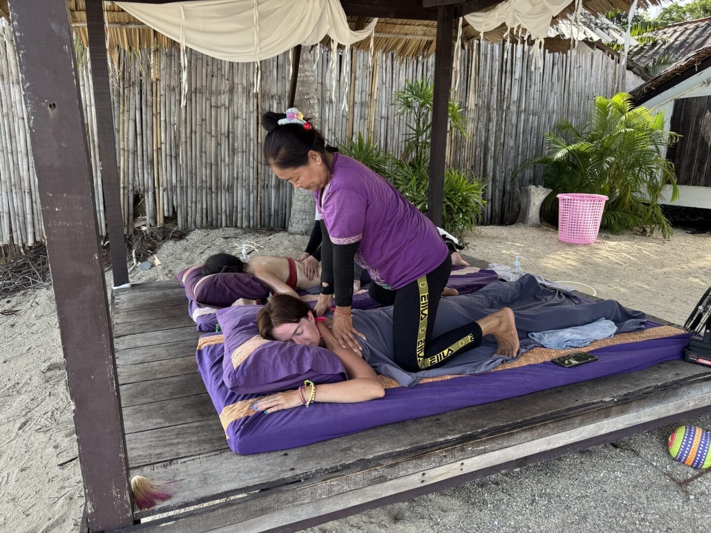 We grabbed lunch at Bubbas café (so good I went twice and bought a shirt!). Came back for our scheduled beachside Thai massage, then volleyball, pool time, and getting ready for the night market.