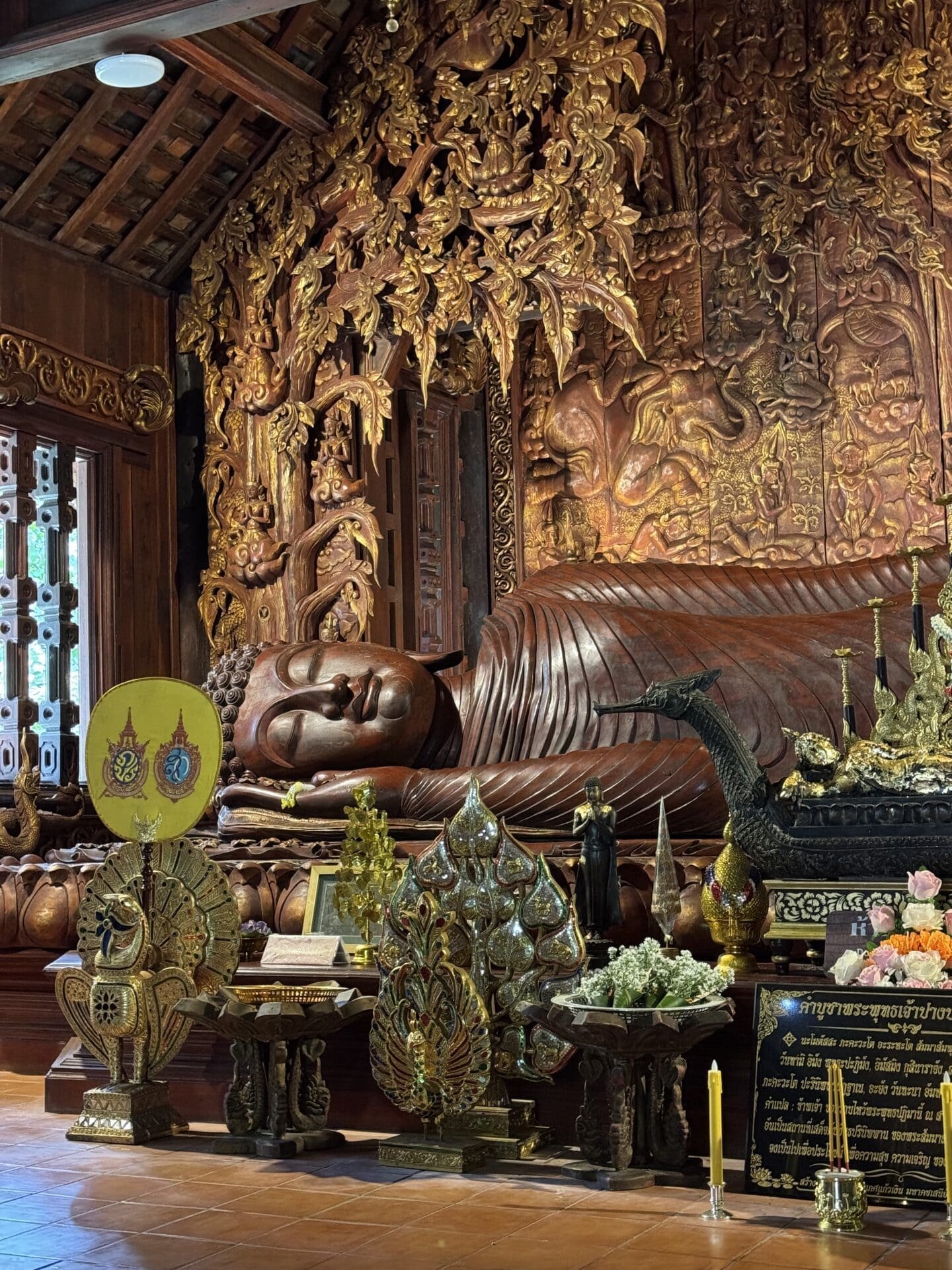 Karen Village visit: A local tour guide shows you how they live, make woven bags, their moonshine, and gives a village tour. Then a songthaew up a bumpy jungle path to lunch at Wat Laung Khun Win—700-year-old temple with beautiful teak Buddhas. Most serene temple ever, tucked in mountains with hardly anyone there. It’s my favorite temple of the entire trip–absoluely magical.