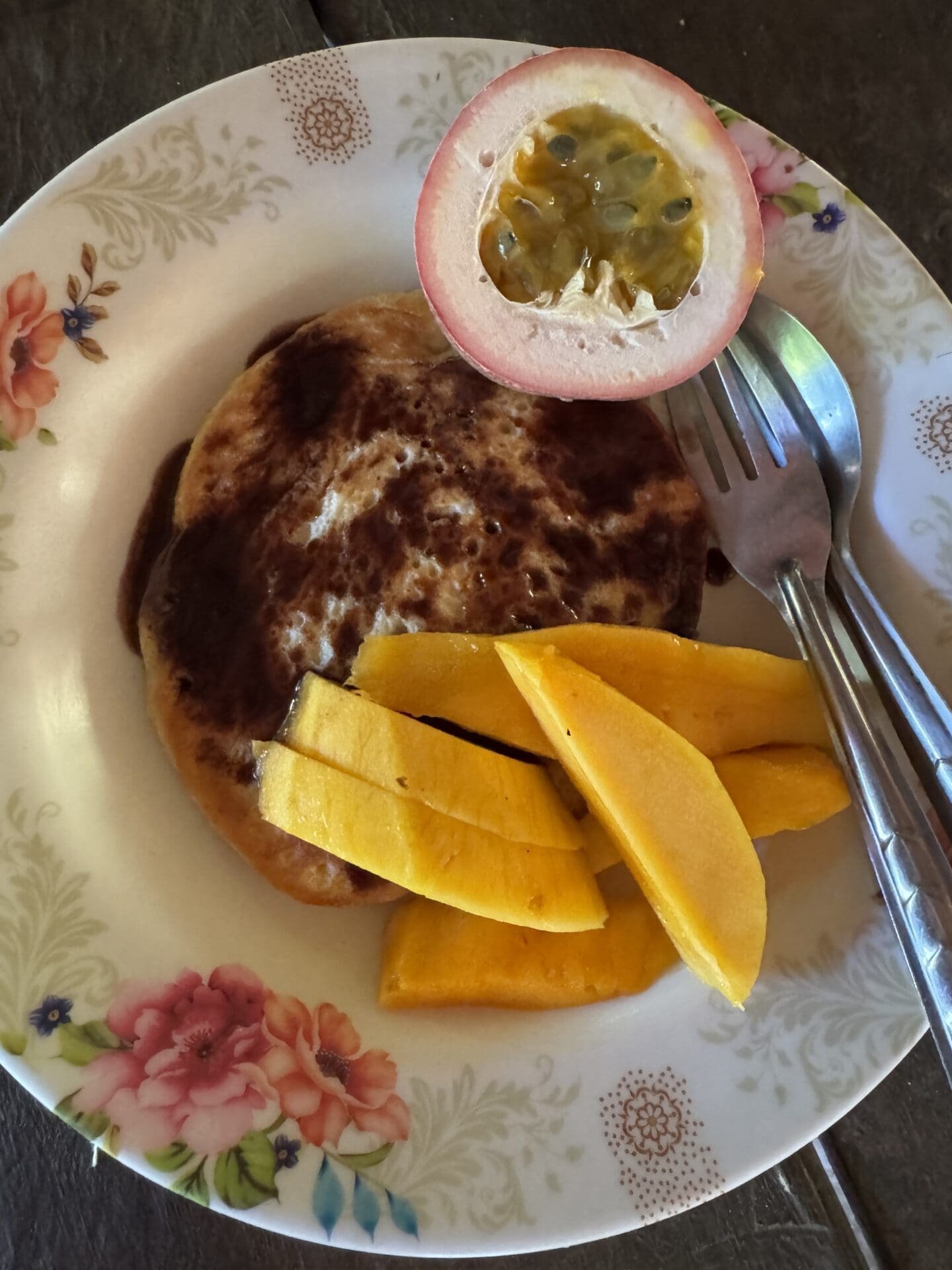 Morning: Coffee at camp made from local beans, tea with jungle honey. Incredible pancakes with chocolate sauce, fresh mangos, and passion fruit. One of the best breakfasts in a once-in-a-lifetime setting in the jungle!