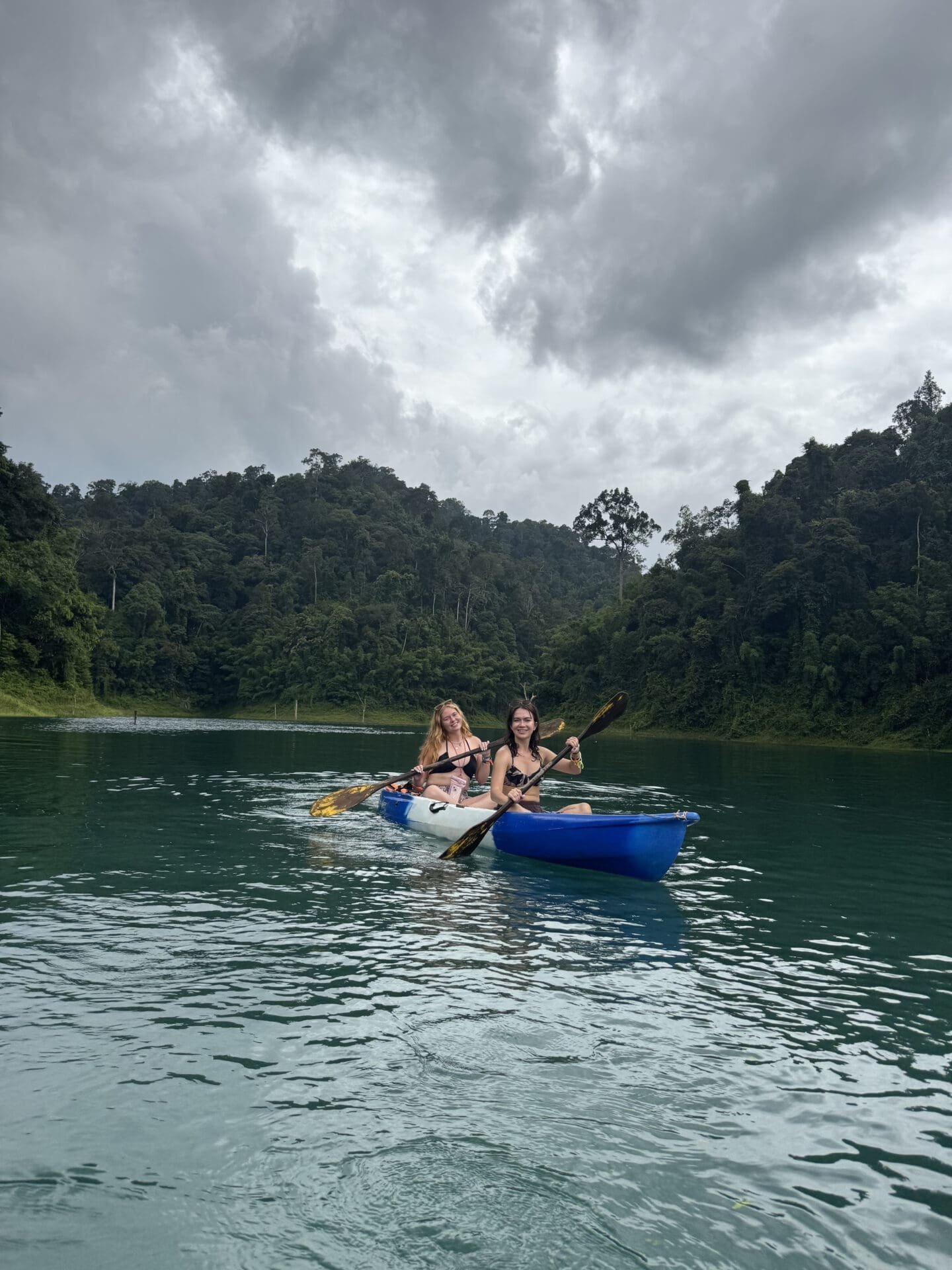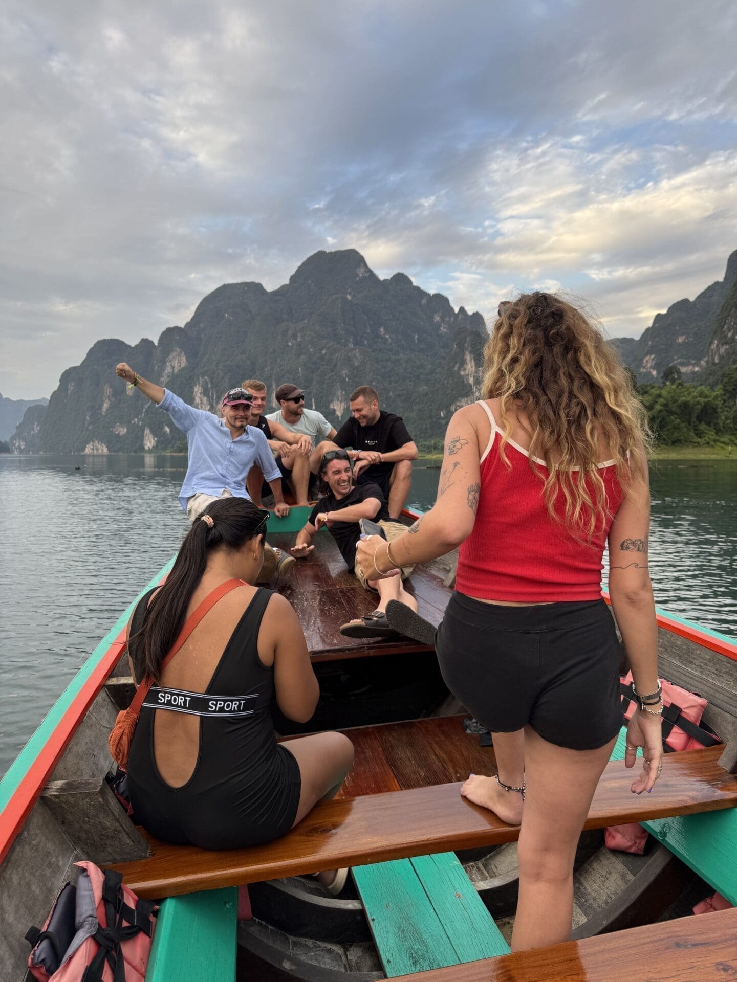 Longtail boat ride: After a van to the dock, you board a longtail boat for an hour-long ride through stunning limestone mountains in Khao Sok National Park. It’s otherworldly. Take the trash bag your group leader offers—you will get wet! 💦