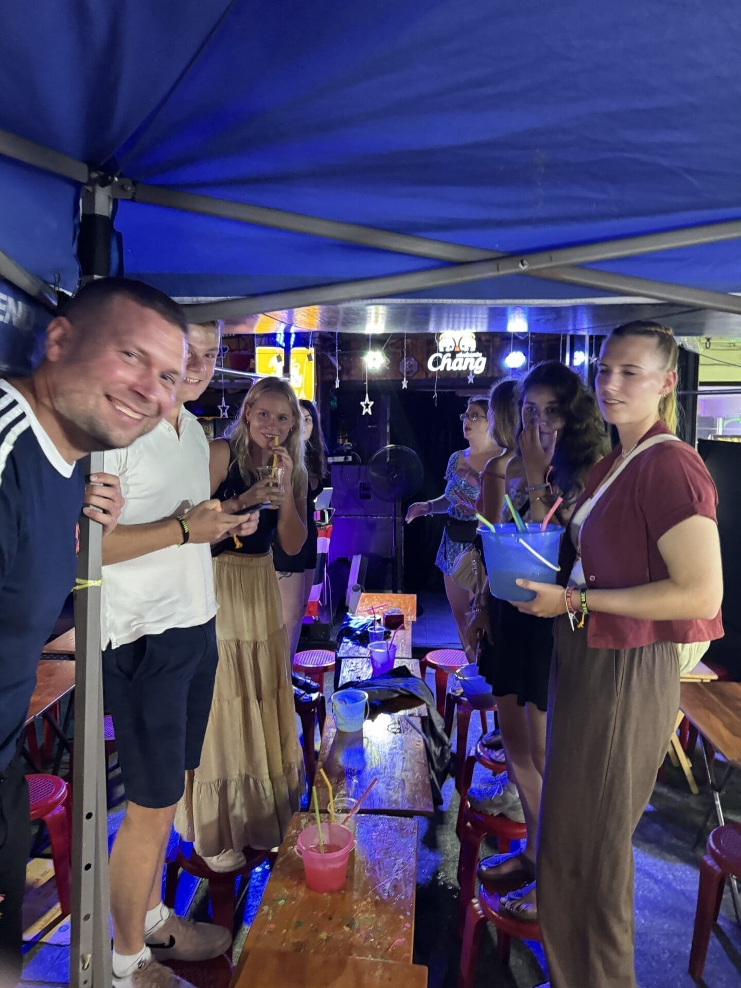Night out: This is one of the BIG group nights. You walk to Khao San Road to a bucket bar for cocktails, dancing. Some brave souls, like myself 😎, ate scorpions and tarantulas from street vendors.