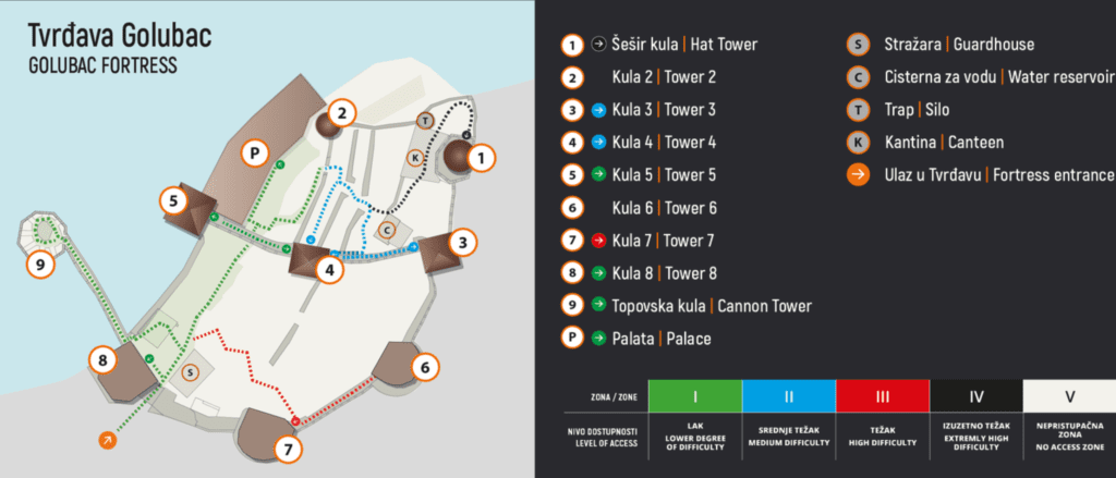 Golubac Fortress consists of 3 main compounds guarded by 9 towers and a palace that you can explore. The fortress is divided in four zones based on difficulty: