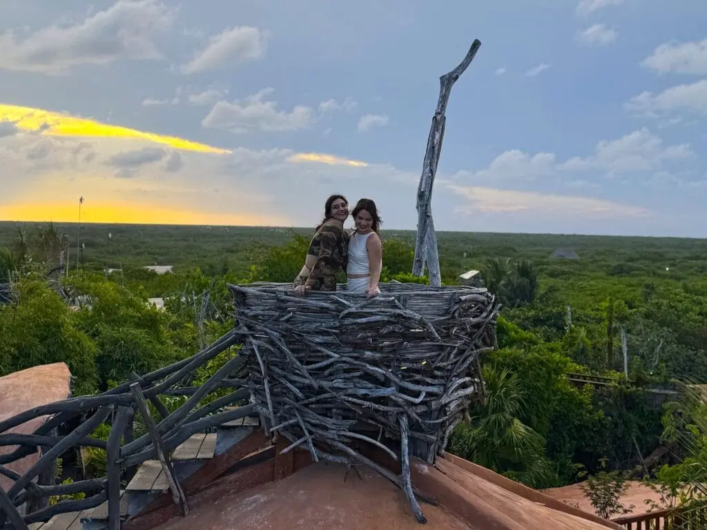 I’m starting strong with what might just be the ultimate bucket list dining experience in Tulum: Kanan Tulum Rooftop Restaurant. Picture this—luxury jungle dining in massive human-sized “bird nests” perched above the treetops, with the Caribbean Sea sparkling in the distance. The atmosphere? Total pinch-me-is-this-real moment.