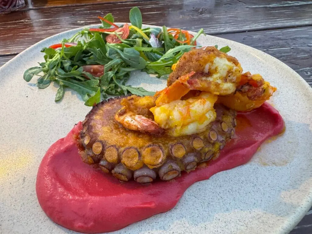 As for the food—it lived up to the view. I ordered the Sea Duo plate with octopus and shrimp (630 pesos / ~$34 USD), which was one of the priciest options outside the steak options. Non-hotel guests should note there’s a $150 USD minimum spend per person, but it’s waived if you’re staying at the hotel. So, if you’re coming as a guest, it’s a steal. Otherwise, be ready to order a few rounds of cocktails and appetizers—come hungry and thirsty.