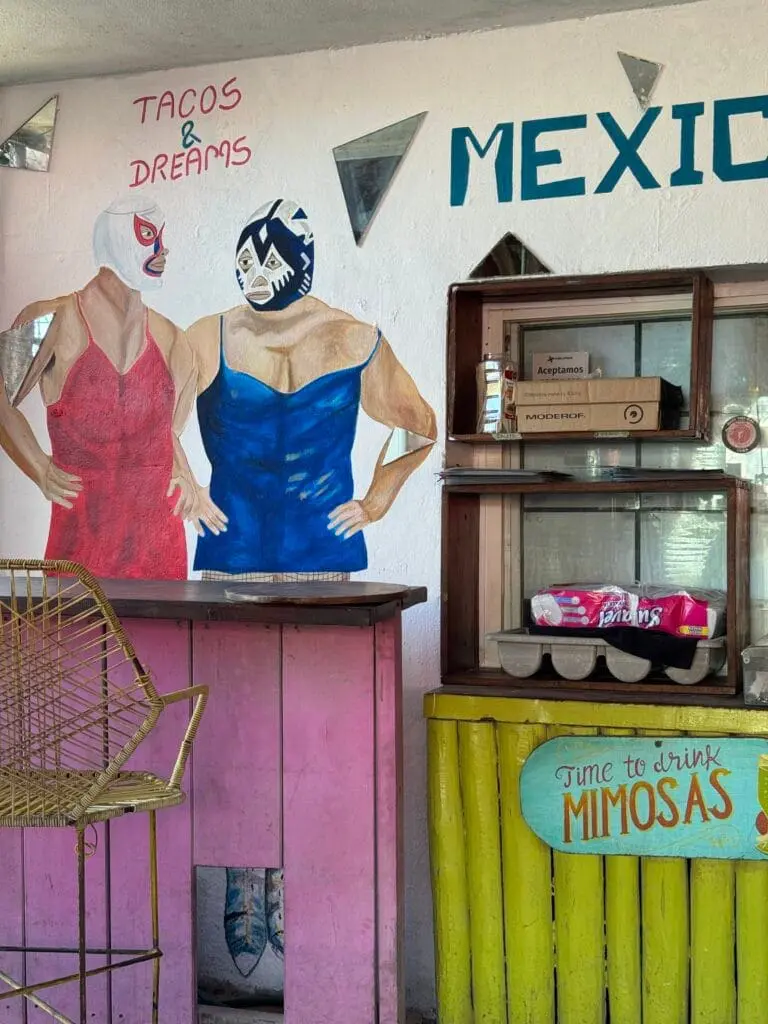 The whole place is a visual delight, with quirky murals of luchadores in dresses, Frida Kahlo on the wall, and brightly colored chairs that make the space feel like a little art explosion. It’s an outdoor seating only setup, which gives it that laid-back, local feel that I love when traveling.