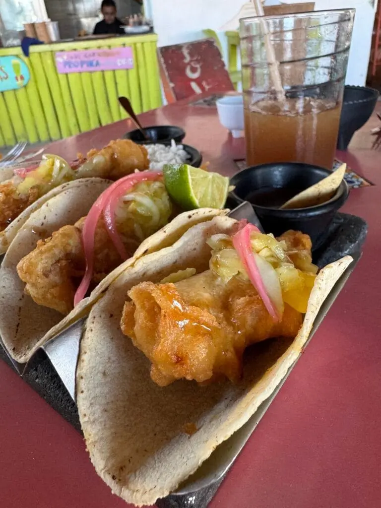 I went with the fish tacos, and let me tell you—they were flakey, fresh, and flavorful. And the best part? The entire plate cost just 195 pesos (around $10 USD). It was the perfect reminder that you don’t have to spend a fortune to eat well in Tulum—you just need to know where to look.