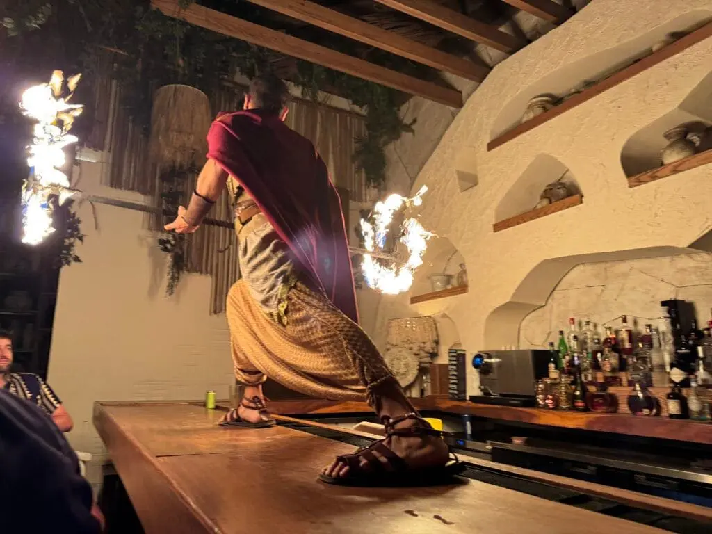 From that moment, dinner turned into a full-blown show. Acrobats flew through the air, fire dancers lit up the space, and women dressed as Greek goddesses floated through the restaurant handing out flowers. It went on for over 20 minutes! At first, we were bummed because a giant tree blocked part of our view—but to our surprise, the performance moved through the whole restaurant. Every seat got a front-row experience. At one point, a buff fire dancer climbed on top of the bar and spun flaming rods just inches from us!