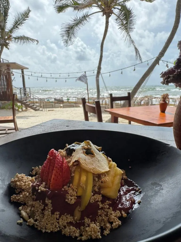 The setting is dreamy. The restaurant sits right on the beach under a breezy, tropical palapa with a stunning view of the Caribbean Sea. The vibe is relaxed, elegant, and exactly what you want your last morning in Tulum to feel like.